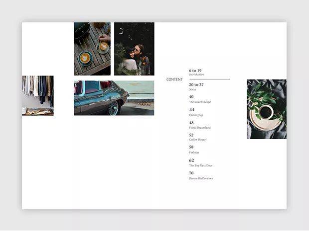 如果目錄的文字比較少,版面就容易顯得很空、很單調,常見的做法是增加圖片或者把文字拉大,其實主動保留大量空白也是一種解決辦法,比如把內容集中排列在版面的頂部、底部、左下角、右下角等位置,留出其他位置的空白。這么處理的版面雖然有一種不平衡感,但動感和設計感更強,大面積的留白還可以適當緩解眼睛的疲勞。